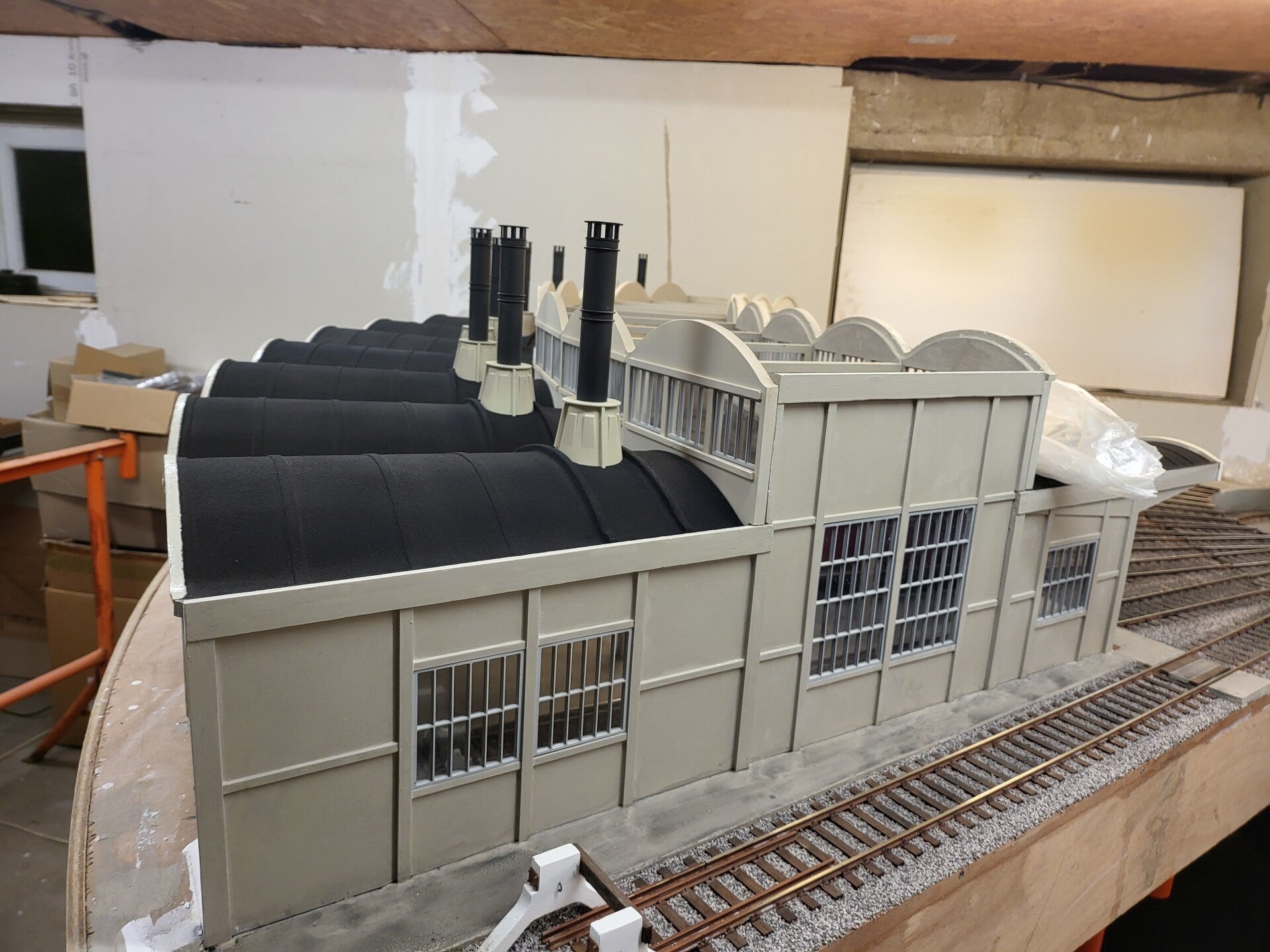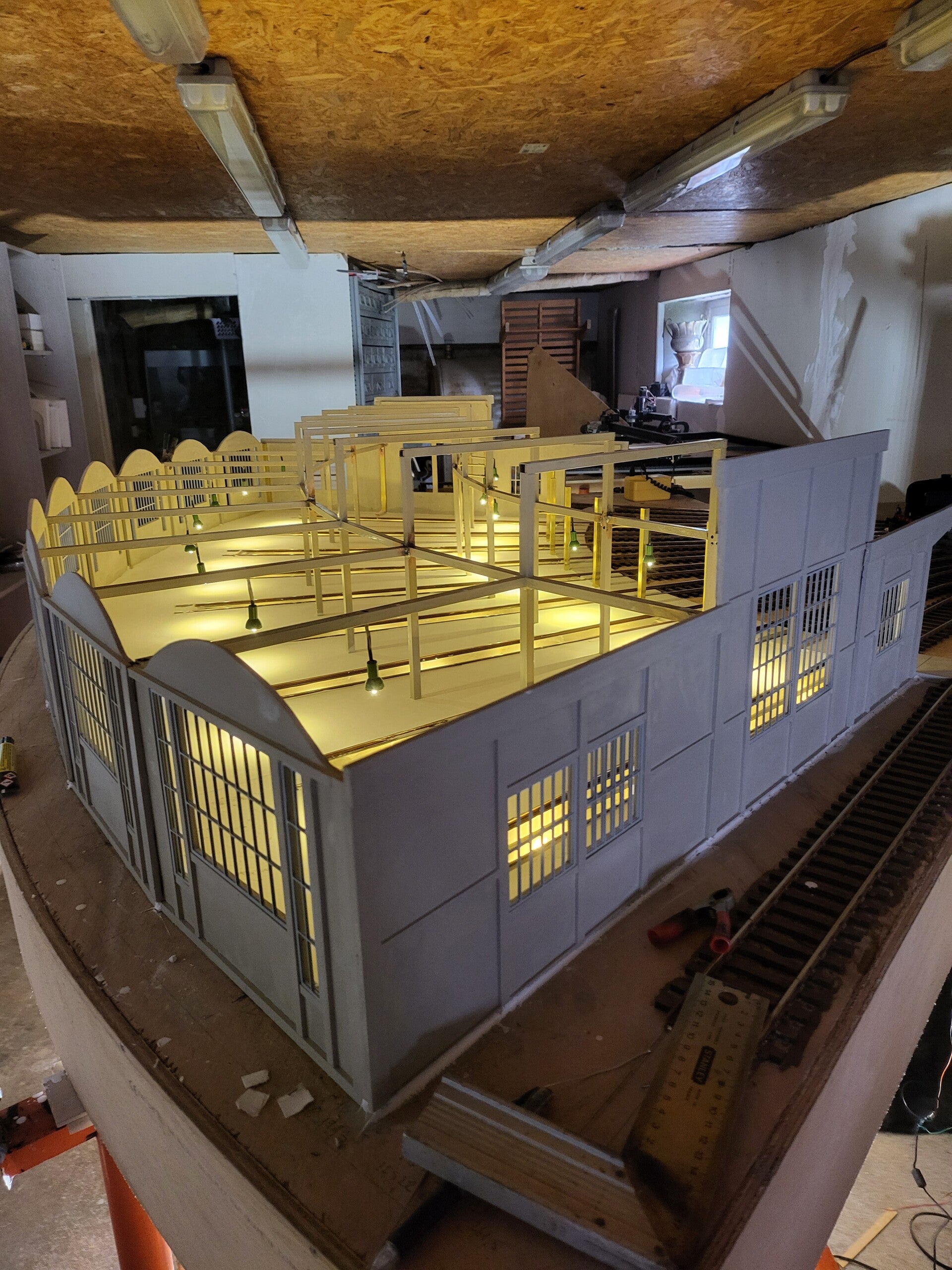 Rotonde type G montée . structure laiton , murs et toits en pierre synthétique, éclairage fosses et intérieur ,rails marklin sur traverses bois . module contre plaque de 12mm CTBX .prix du garage 1200€ .Minimum de commande 8 garages .